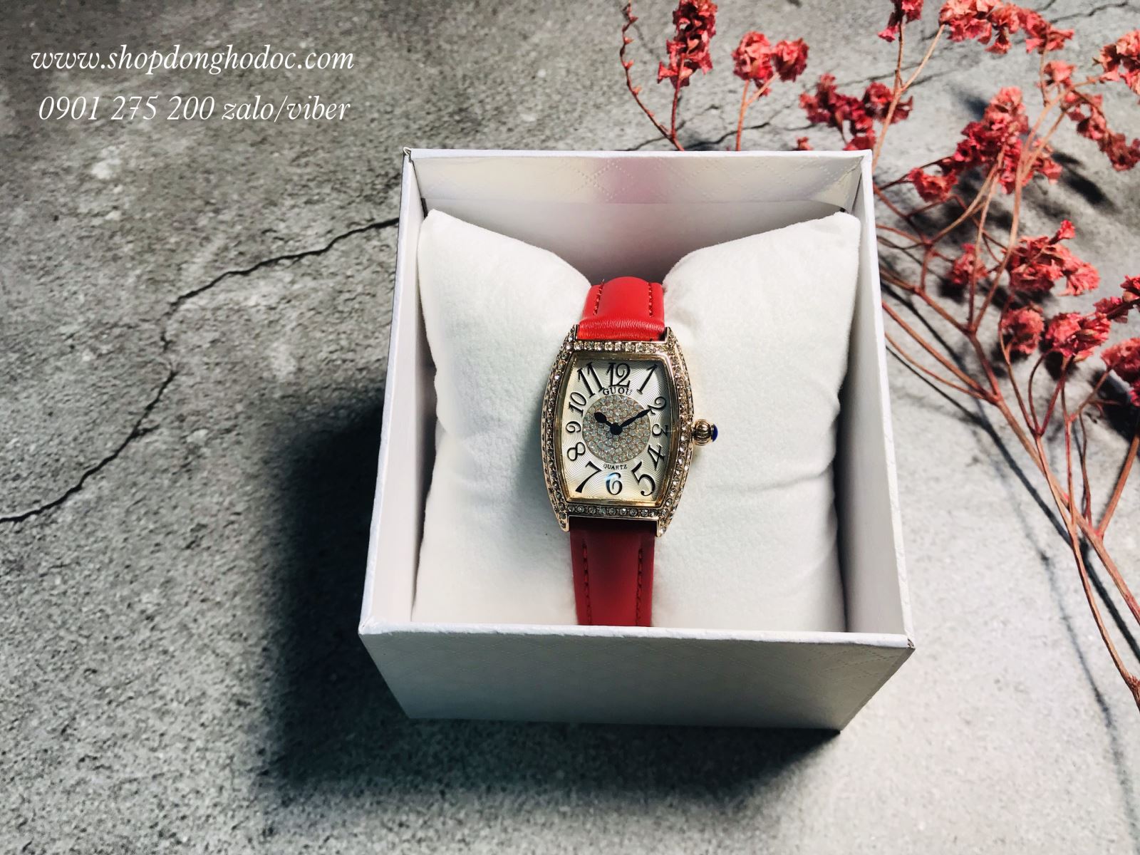 5. Đồng hồ nữ dây da đỏ mặt chữ nhật oval trắng đính đá viền vàng sang chảnh Guou ĐHĐ12907