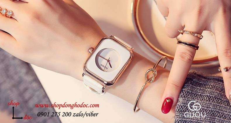 2. Đồng hồ nữ dây da mặt chữ nhật trắng sang chảnh Guou ĐHĐ23201